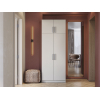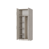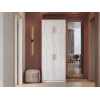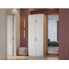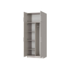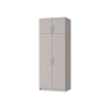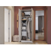 За распашными дверцами скрыто пространство с полками и штангой для верхней одежды. Антресольная секция идеальна для сезонных вещей и постельных принадлежностей. Матовые фасады с текстурой дерева и контрастные вертикальные ручки подходят под разные стили интерьера.