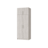 За распашными дверцами скрыто пространство с полками и штангой для верхней одежды. Антресольная секция идеальна для сезонных вещей и постельных принадлежностей. Матовые фасады с текстурой дерева и контрастные вертикальные ручки подходят под разные стили интерьера.